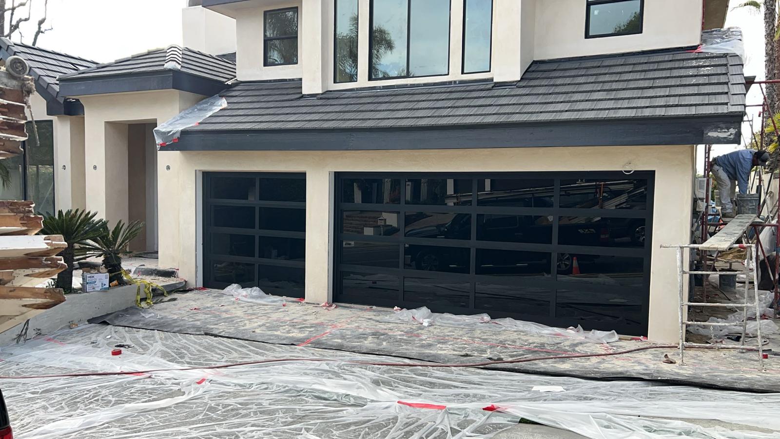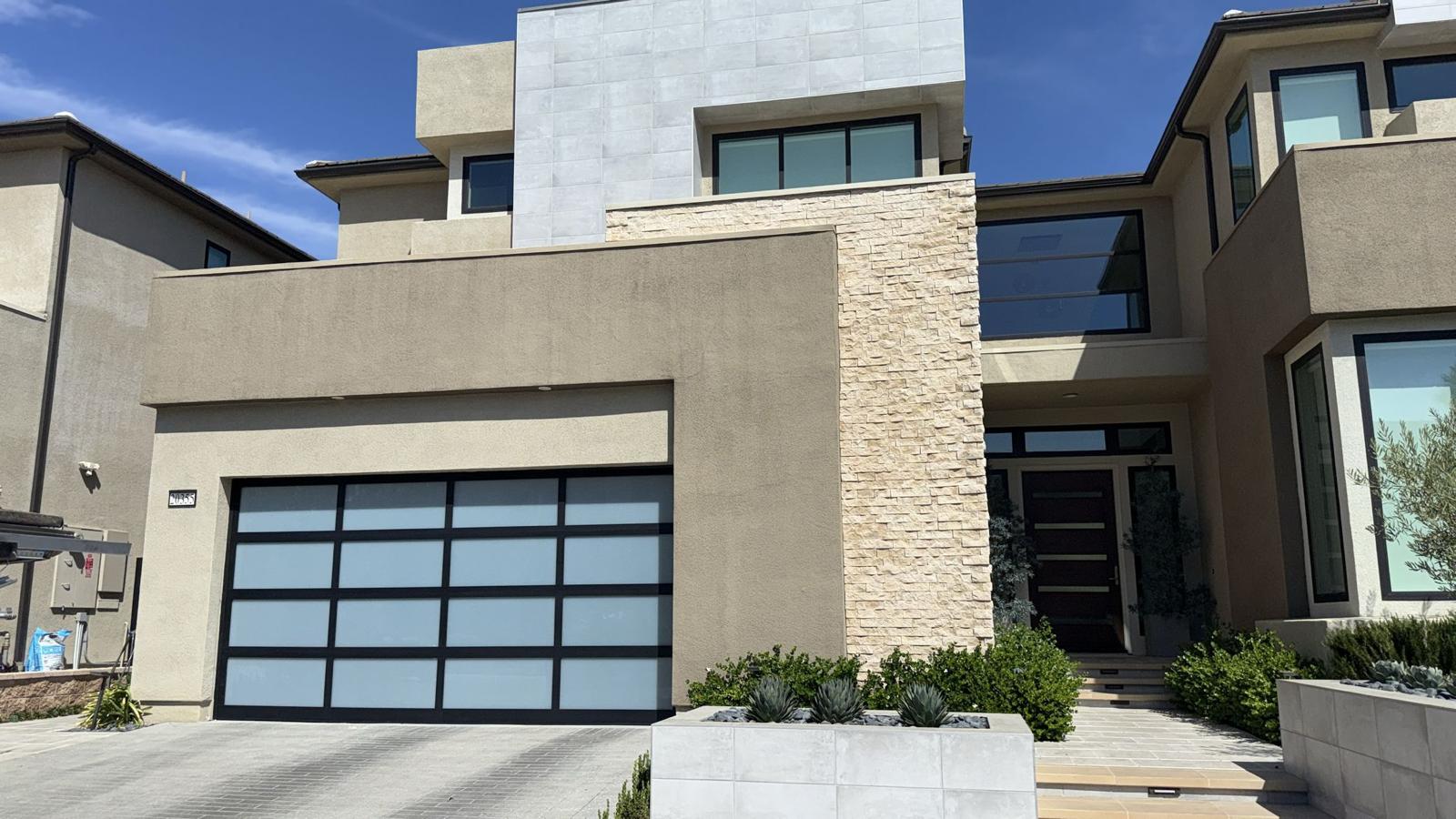 This tan Southern California home features a crisp white garage door with modern window panels—professionally installed by a local garage door company.
