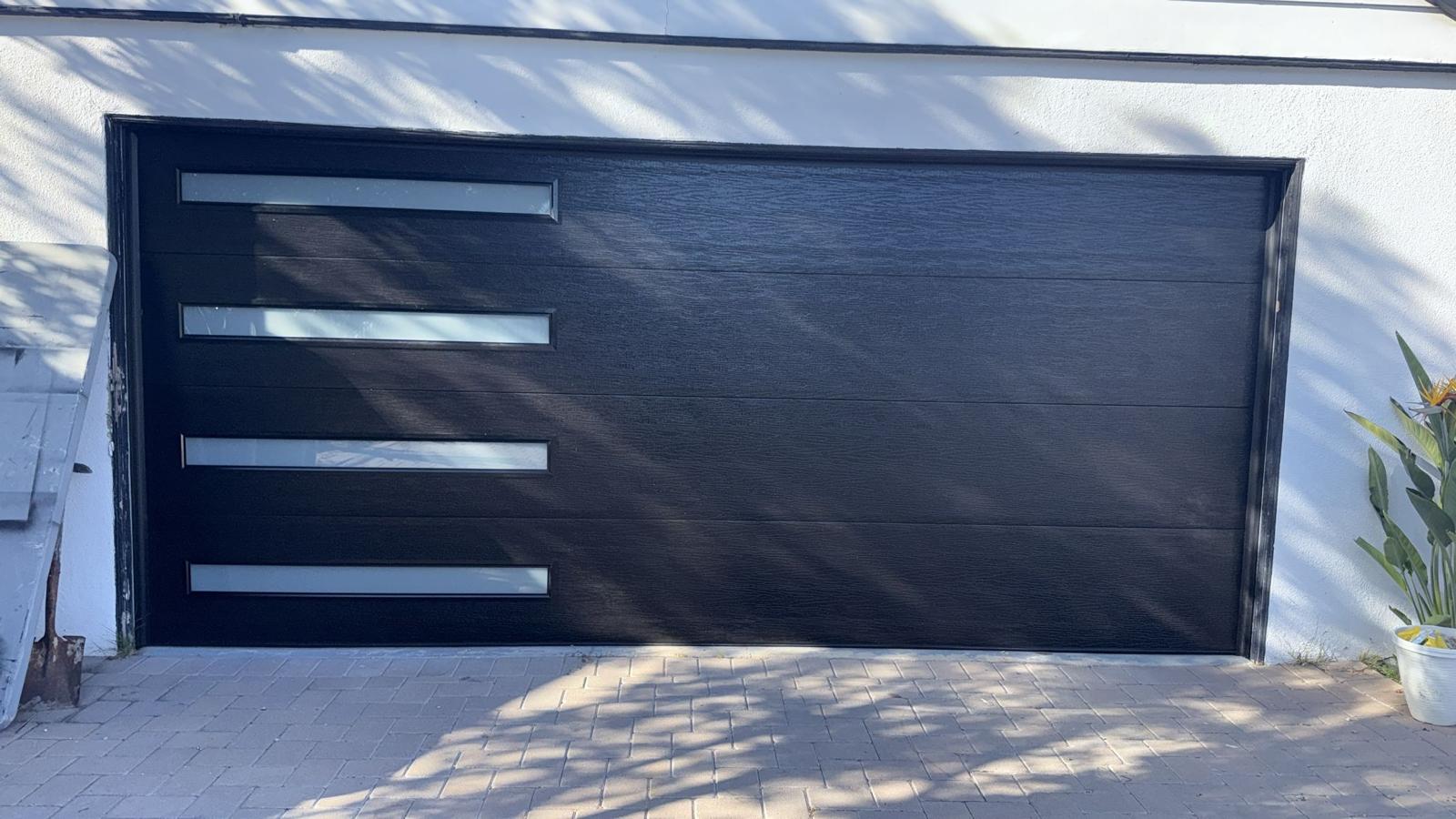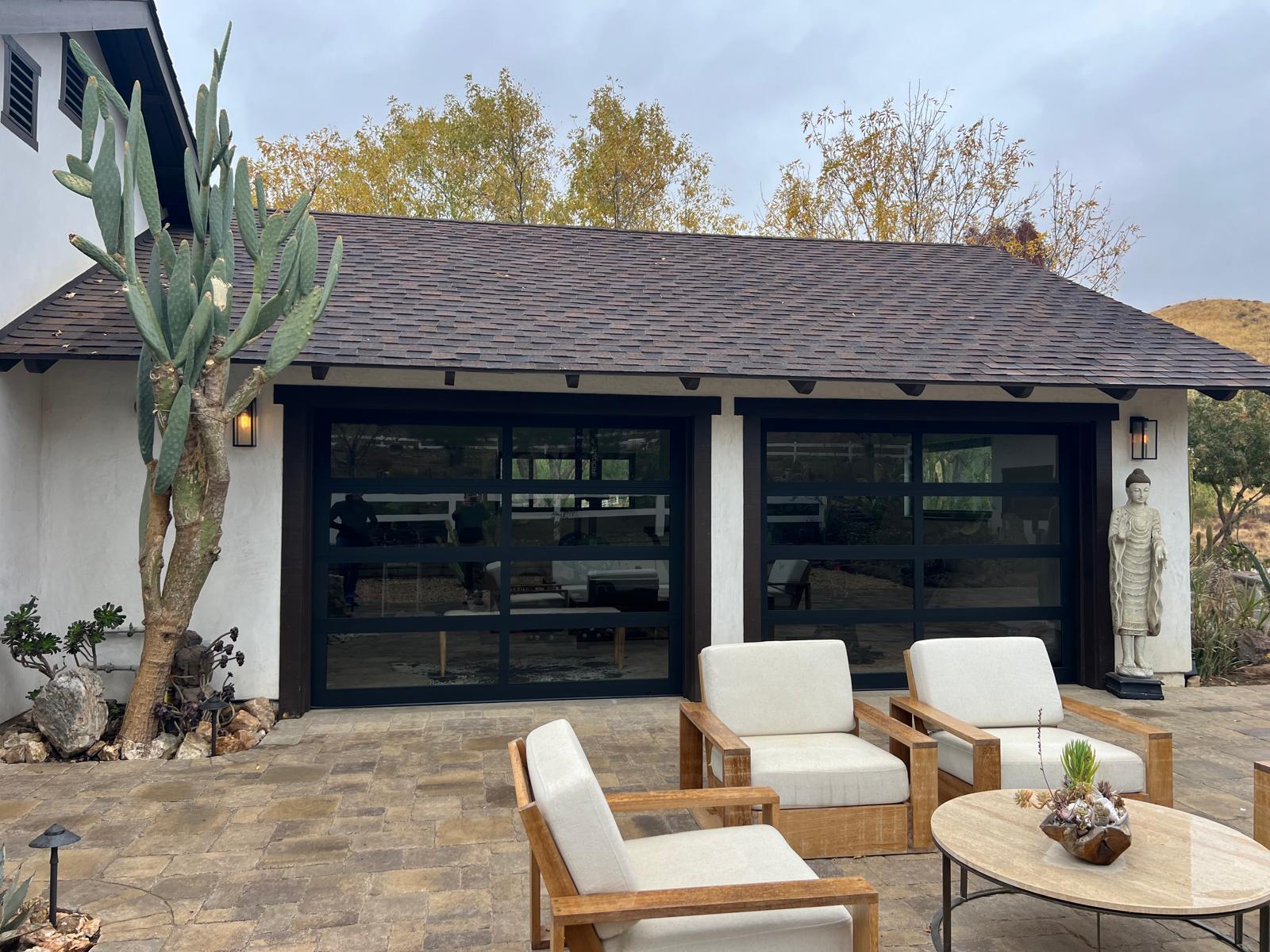 A garage door company installed these stylish dark-paneled garage doors with upper glass inserts, enhancing this home’s curb appeal and function.